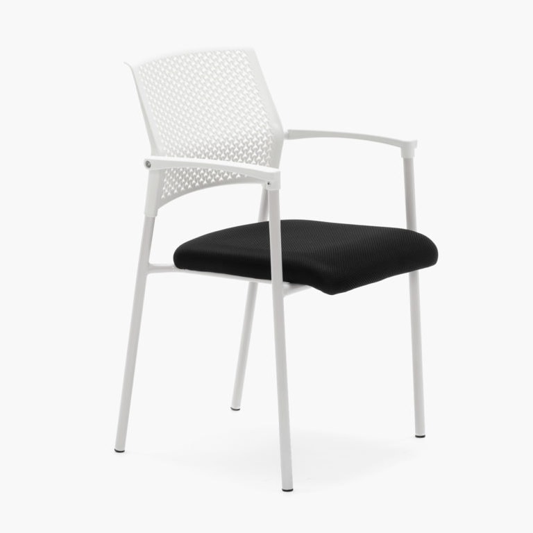 Respaldo ergonómico de PVC con superficie texturada antideslizante y perforada. Asiento tapizado en “Nido de abeja” con gran acolchado, color negro. Estructura fabricada con tubo de acero acabado en color negro o blanco. Apilable a 6 alturas. Caja de 4 unidades.