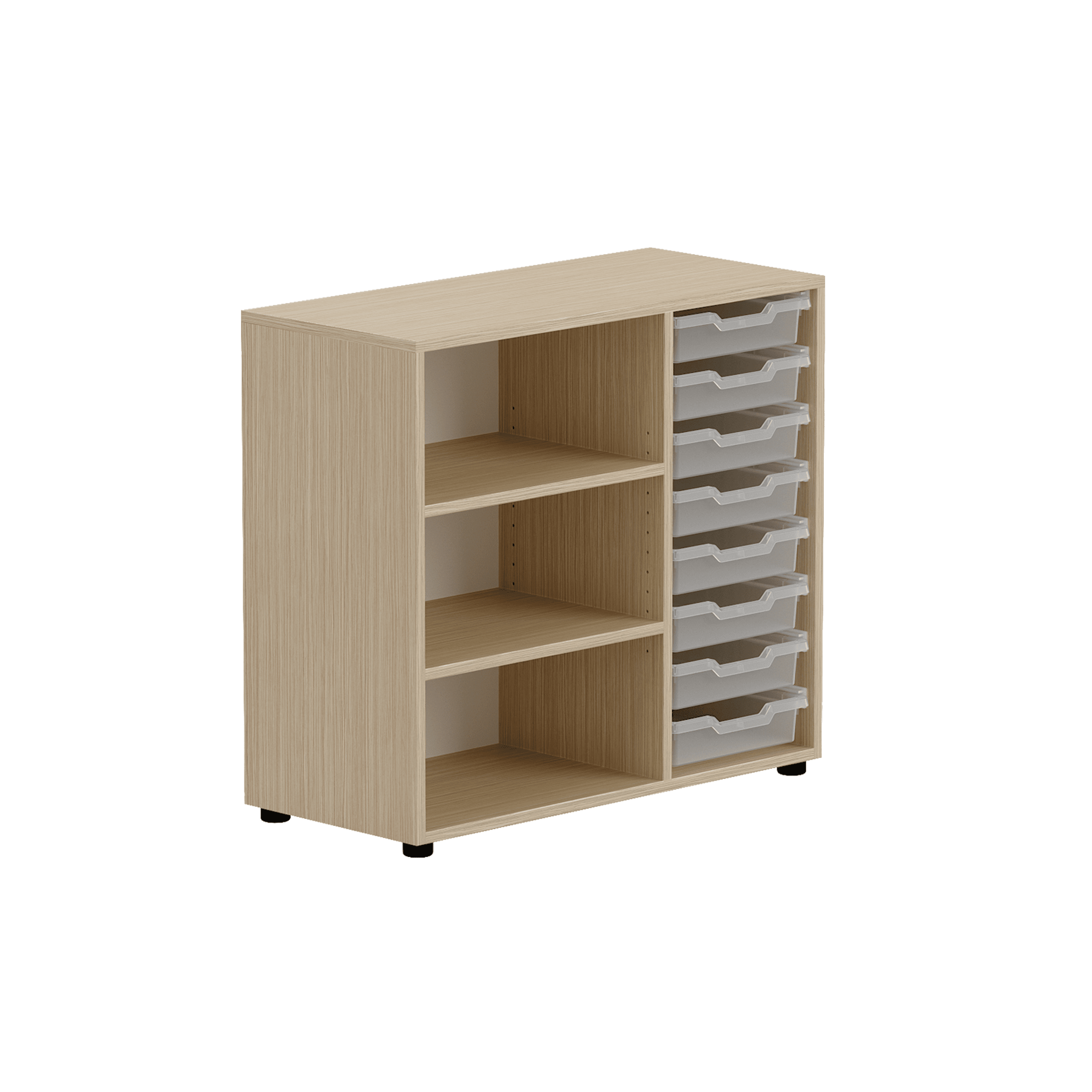Estantería gavetero baja fabricado en cuerpo de melamina acabado madera nórdica y trasera en melamina blanca.