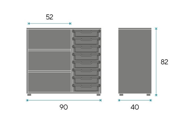 Pies regulables en altura. Provisto con guías para gavetas planas y hondas indistintamente. Medidas 90 ancho x 40 fondo x 82 alto