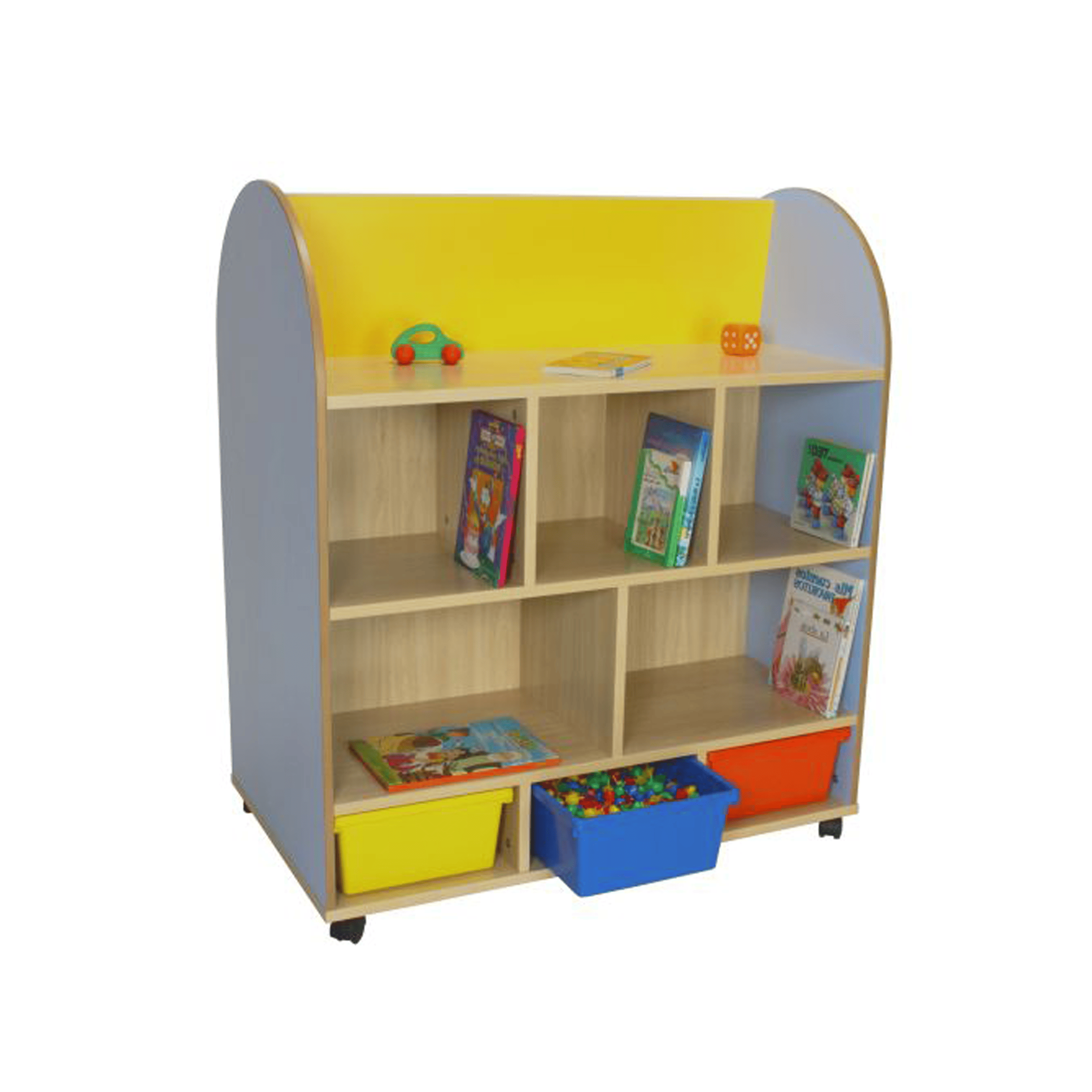 Expositor de libros accesible por las dos caras. Por una cara permite almacenar y exponer libros de frente, con barra cilíndrica delante, para impedir la caída de los mismos. Por la otra cara, dispone de zona estantería donde almacenar todo tipo de elementos de lectura y fila de cubetas, en la parte baja.