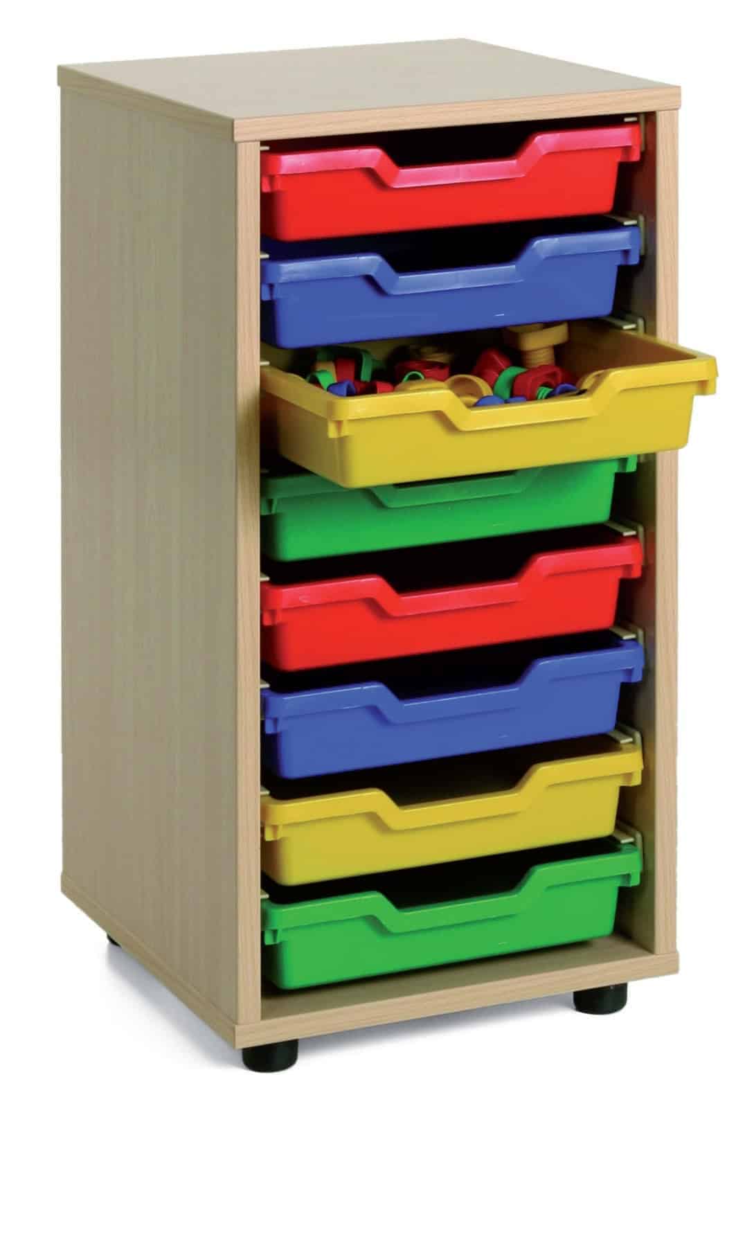 Gavetero con 8 gavetas pequeñas Fabricado en melamina de 19 mm.. con canto en PVC. Trasera de 10 mm… Pies niveladores de PVC para evitar la humedad y desniveles. Estos pies pueden ser retirados par poder apilar distintos armarios. Opcionalmente se puede color cerradura
