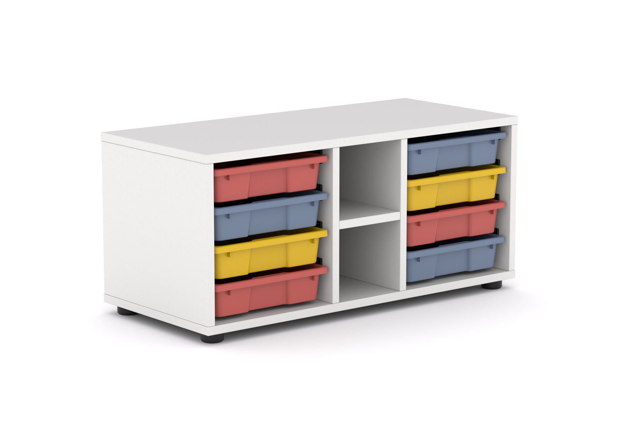 Gavetero super bajo fabricado en melamina. Cuerpo de 19mm. y trasera de 8mm. de espesor. Patas de PVC con nivelador interior. 1 estante pequeño de 19mm. canteado en PVC.