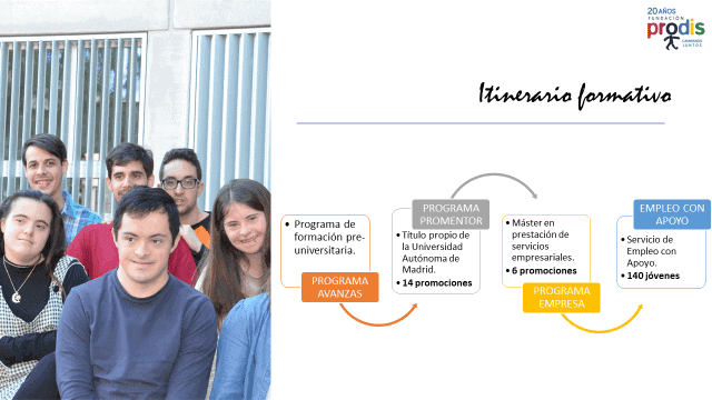 Con este objetivo, La Fundación Prodis ofrece a las empresas la posibilidad de contratar a jóvenes que han completado un itinerario académico de cuatro años que, además de proporcionar una formación universitaria, les prepara para el alto nivel de exigencia del desempeño laboral en una empresa.