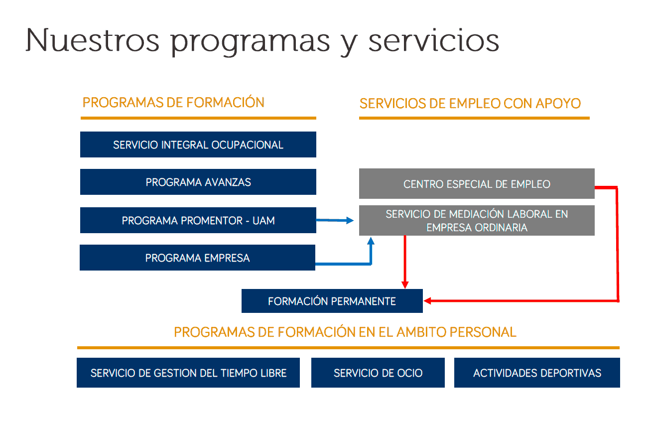 Disponemos de una amplia variedad de actividades, que van desde nuestro Servicio Integral Ocupacional, hasta el empleo en la empresa ordinaria, pasando por nuestros programas formativos, o nuestro centro especial de empleo. Y esta variedad, se pone a disposición de las más de 450 personas con discapacidad intelectual a las que acompañamos cada día, para que nuestra construcción de apoyos se realice desde la necesidad real de cada uno, y con una visión de futuro.